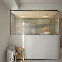 To give visual softness to the interior, almost all corners and intersecting planes of the apartment are curved, the walls are white, and the only accents are expressed through furniture made of wood and pink basalt.